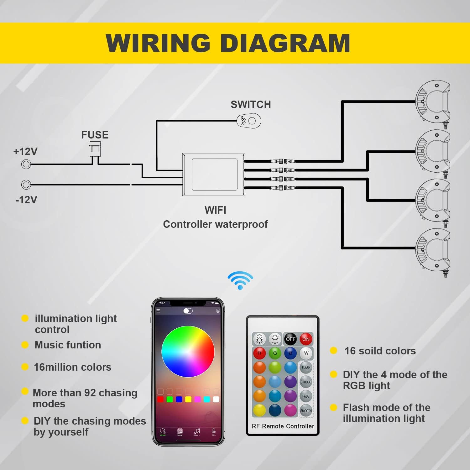 4.【APP Automatic Control】APP Controlled & Remote Control & Music Mode & Flashing Function & Automatic Control Functions, which can control 4 sets of lights together.Meet your lighting preferences while improving night time visibility around your vehicle.Million of colors you can choose and the RGB LED lights kit will follow the rhythm of your music or your voice to glow, including rock, relaxing tunes and dance music.