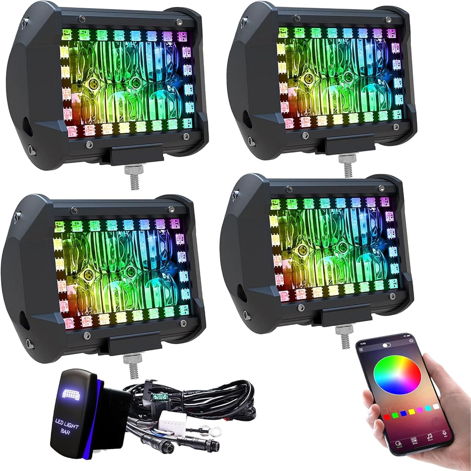 4" inch LED Pods Flood Work Light Bar with Multi-Color Chasing RGB Halo 16 Solid Colors Over 92 Flashing Modes Offroad Pods Lights LED Driving Lamp Fog Lights with Switch Wiring Harness