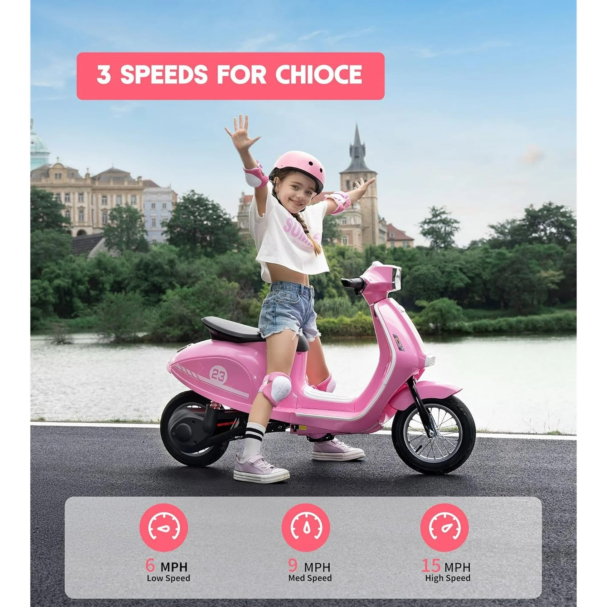 【Authentic Retro Motorcycle Experience】:Designed with LED lights, hand brakes, twist throttle, and a horn, this kids electric motorcycle mimics real riding! Its vintage Italian-inspired look makes it a hit as motorcycle for kids.
