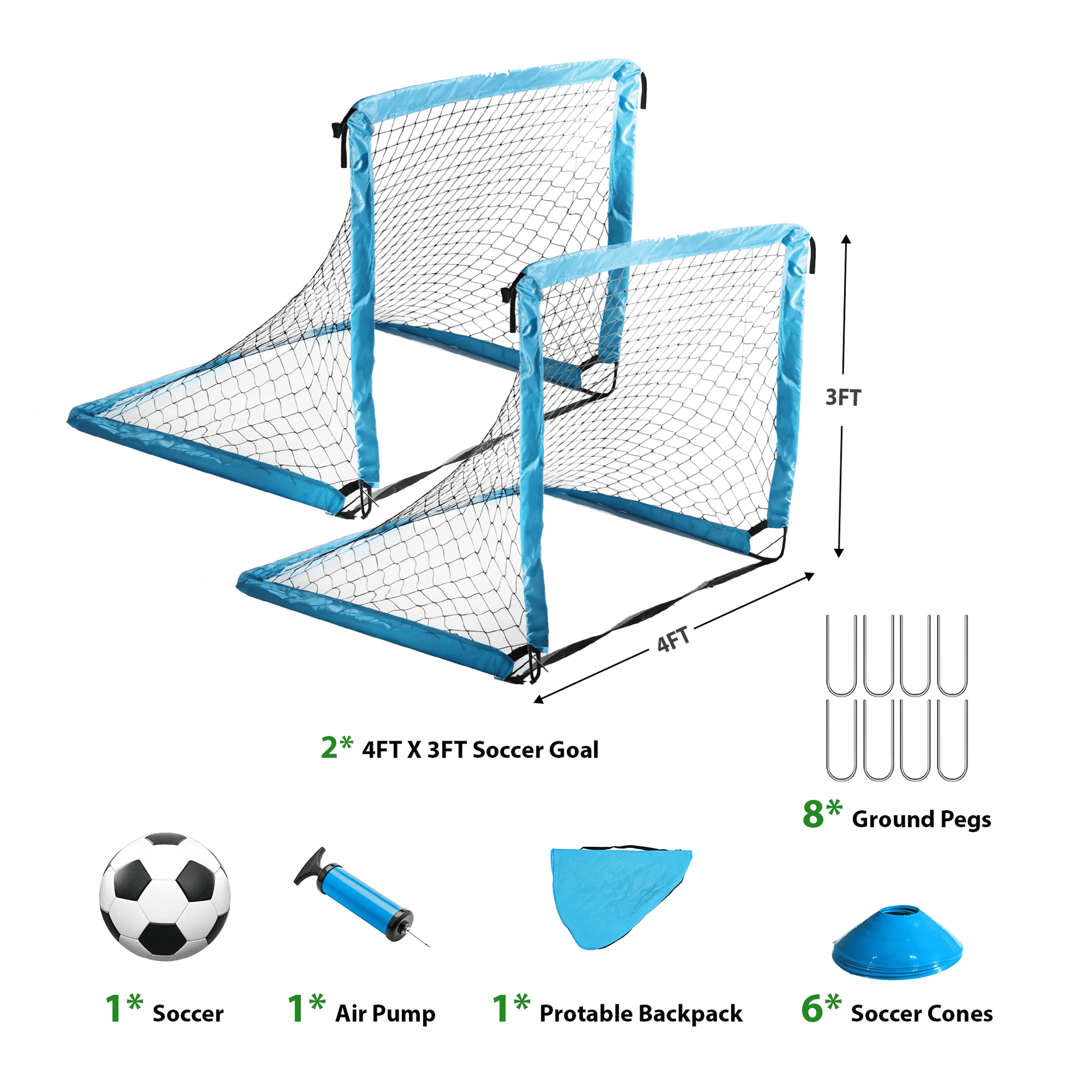 Turn any space into a soccer field with this savejoy portable soccer set! Watch kids score goals in the backyard while you grill nearby, or enjoy a match on the beach as the sun sets. Rainy days become indoor penalty shootouts—every moment is full of laughter and excitement. Perfect as a gift for children, it’s easy to set up and carry. The set includes two 4'x3' goals, one soccer ball, 10 marker cones, a pump, and a carry bag. With professional-grade stability and all-weather nets, it offers safe and thrilling gameplay anywhere. Dual goals allow for realistic matches and synchronized training. Quick assembly, no tools needed—fun starts instantly!