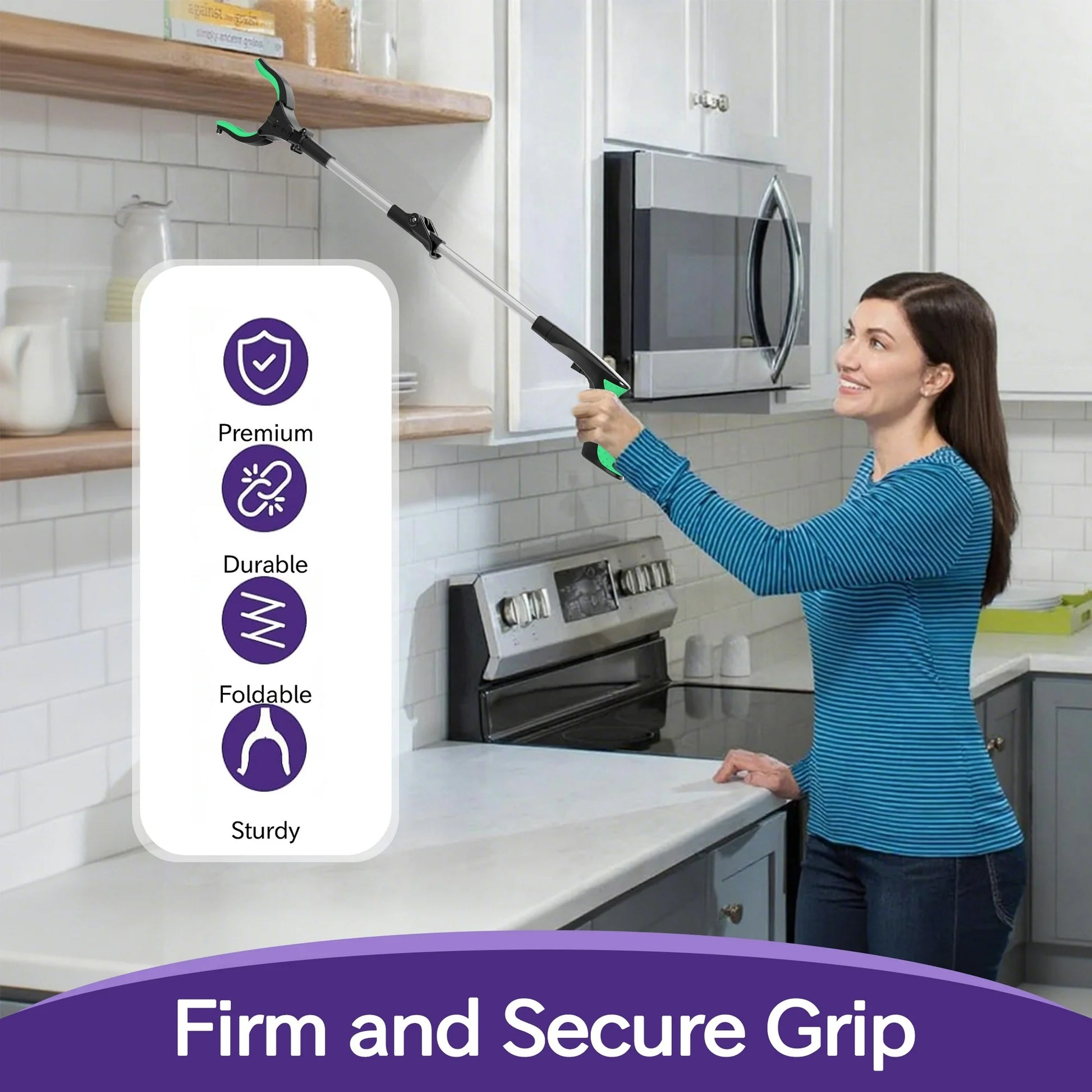 - 🟢Long grabber tool up to 32" trash grabber pick up tool from floor, top shelf, outdoor lawn, trash can, behind furniture, hard to reach or tight spaces. Foldable for travel, easy carry, store away.