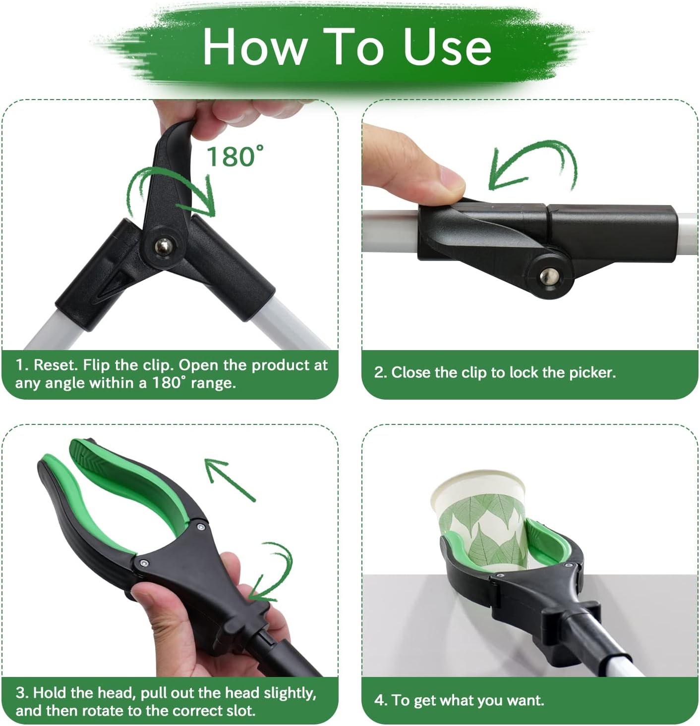 【Comfort Handle & 90° Rotating Jaw】 90° Rotating head is 4.0" wide, allowing both vertical and horizontal reaches. Made of soft rubber, the ergonomic grabber can pick 0-5.5 lbs weights. The magnetic tip of the top can hold 200g/7oz as well.