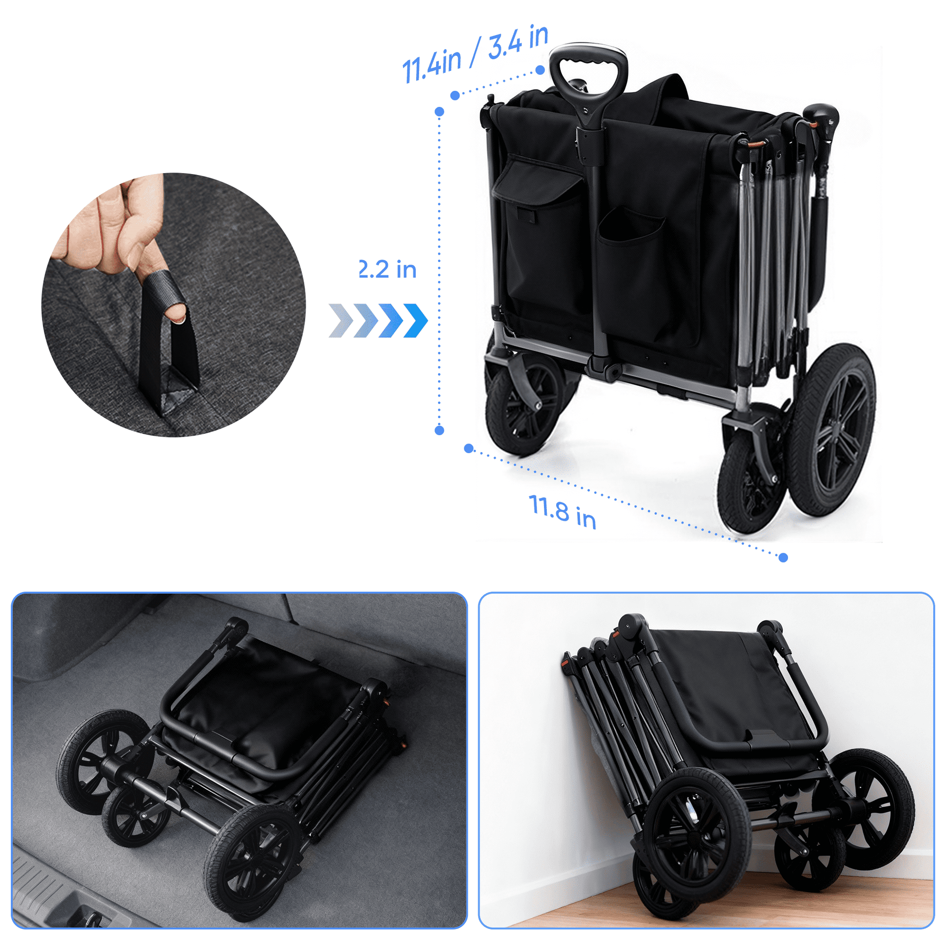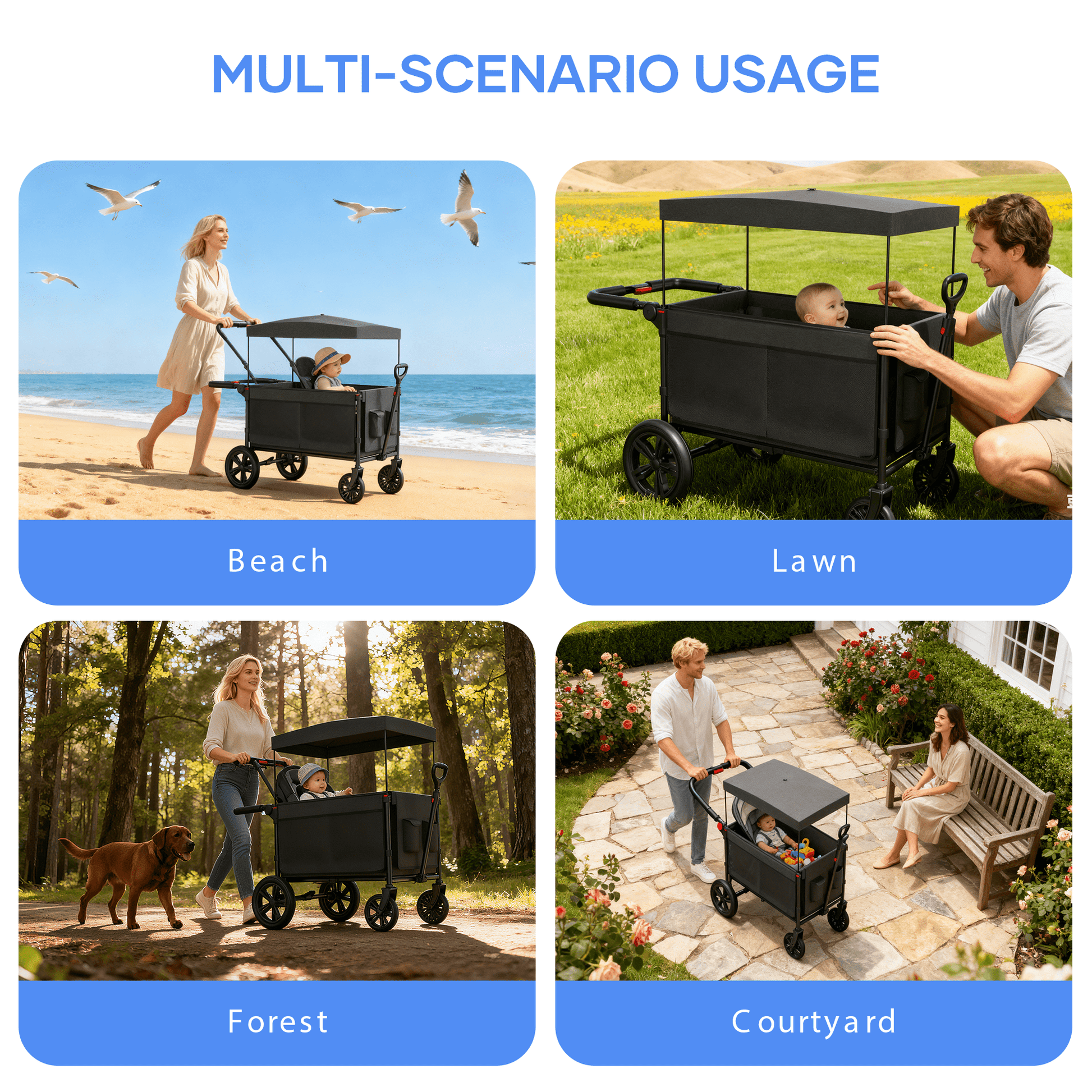 SaveJoy wagon stroller is new wagon stroller designed. It has four seats and can hold a maximum combined weight of 220 pounds. The stroller features an adjustable push handle, retractable pull handle, four 5-point safety harness, one-touch rear brake, and a detachable UV-protection canopy. These versatile features make your trips more enjoyable. Thoughtful storage options, such as cup holders, side pockets, and a rear storage bag, make it an ideal choice for family outings.
